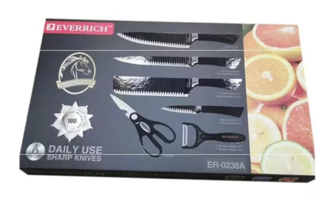 • Cuchillo de Chef (longitud de la hoja 20 cm) • Cuchillo de Pan (longitud de la hoja 20 cm) • Cuchillo para Carne (longitud de la hoja 20 cm) • Cuchillo Universal (longitud de la hoja 9 cm) • Pelador (longitud de la hoja 3.5 cm) • Tijeras (longitud de la hoja 7.5 cm)
